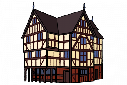 une maison à colombage : maison à pans de bois, avec des petites poutres apparentes sur la façade
