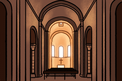 (une église) romane : de style roman (Xe siècle), caractérisé par des voûtes rondes