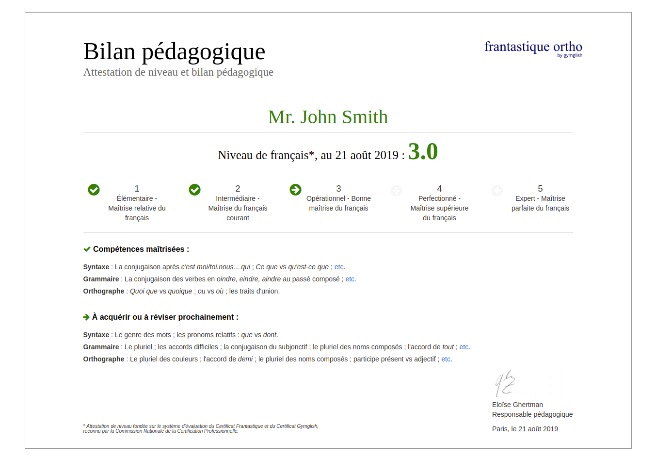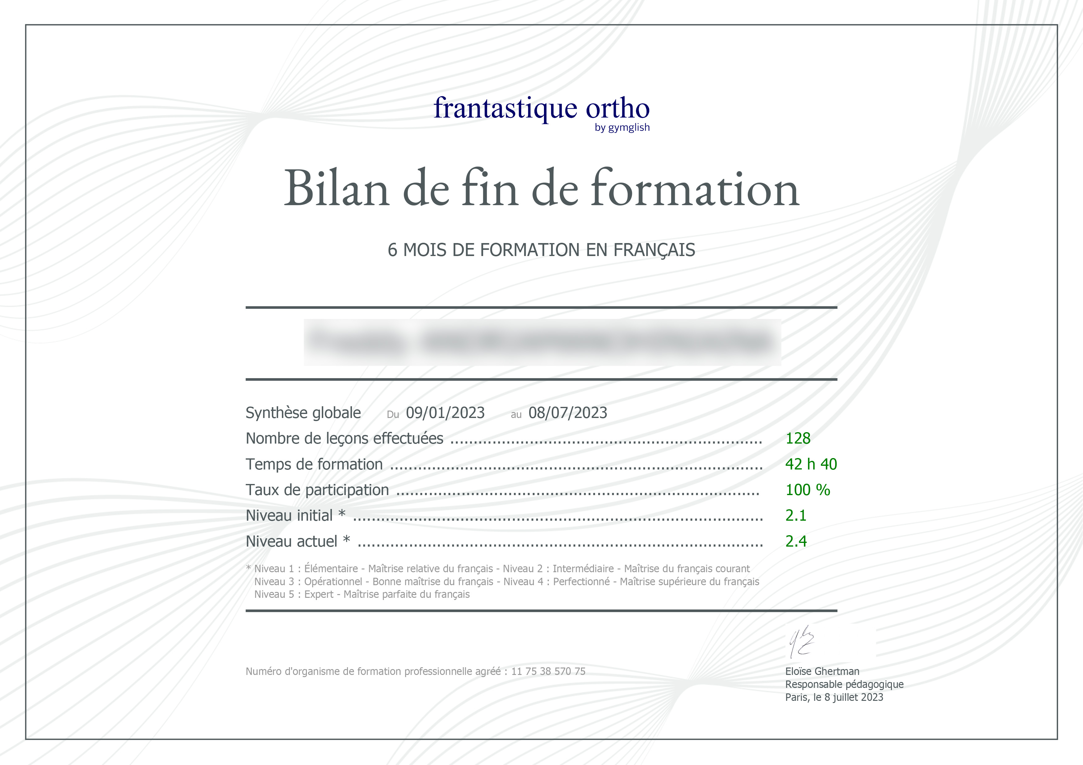 En fin de formation (6 mois minimum), chaque utilisateur reçoit son bilan pédagogique avec l'ensemble des statistiques de niveaux, progression et participation. Ce document renseigne non seulement sur les niveaux constatés en fin de formation, mais aussi sur les efforts d’apprentissage, taux d’assiduité, temps de formation, nombre de leçons traitées, etc.