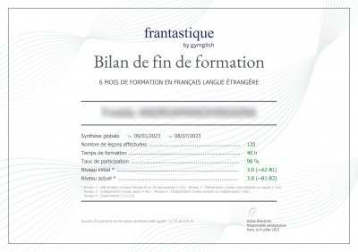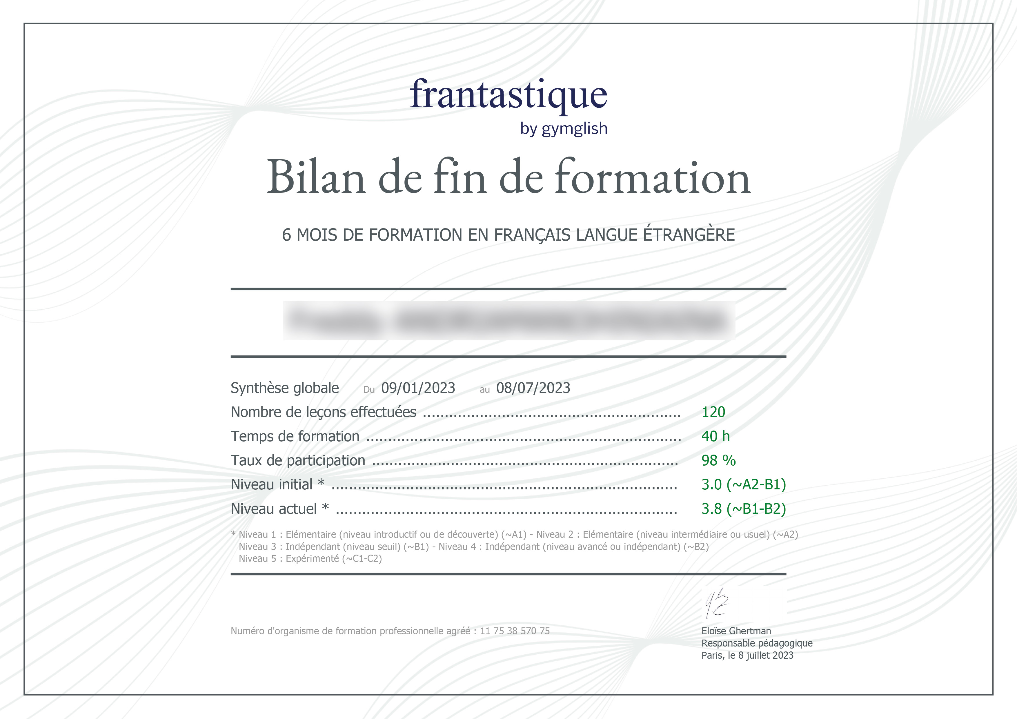 En fin de formation (6 mois minimum), chaque utilisateur reçoit un bilan pédagogique avec l'ensemble des statistiques de niveaux, progression et participation. Ce document renseigne non seulement sur les niveaux constatés en fin de formation, mais aussi sur les efforts d’apprentissage, taux d’assiduité, temps de formation, nombre de leçons traitées, etc.
