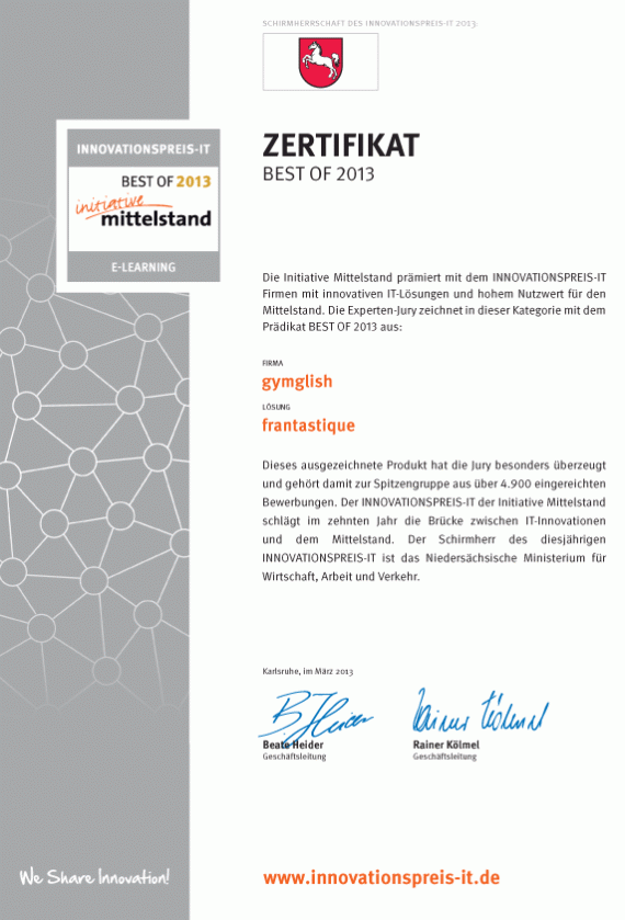 Frantastique a reçu le titre "Best-Of-Lösungen" par Innovationspreis-IT 2013 en Allemagne