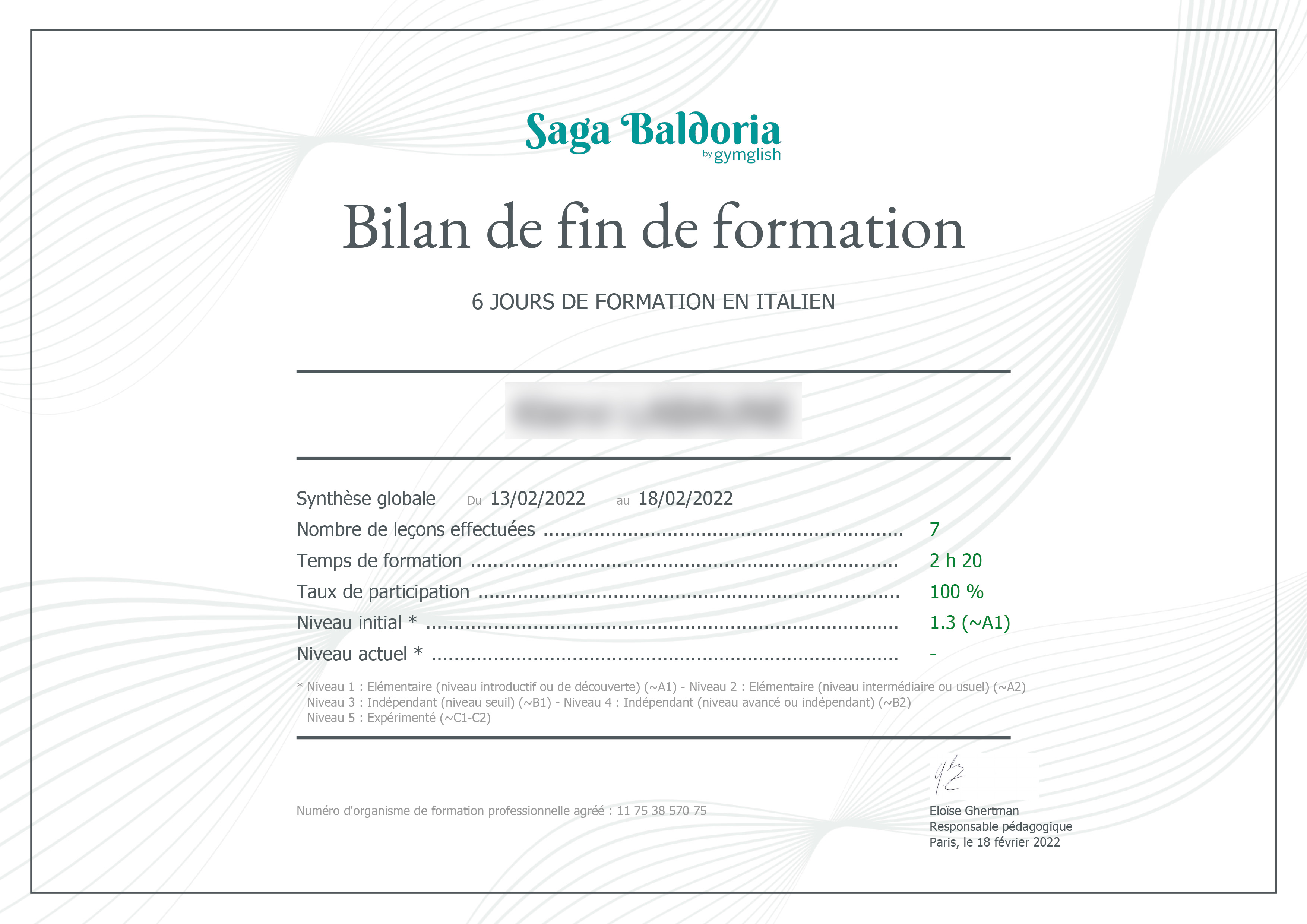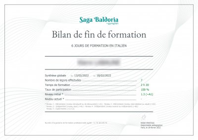 En fin de formation (6 mois minimum), chaque utilisateur reçoit un bilan pédagogique avec l'ensemble des statistiques de niveaux, progression et participation. Ce document renseigne non seulement sur les niveaux constatés en fin de formation, mais aussi sur les efforts d’apprentissage et révision faits en amont, taux d’assiduité, temps de formation, nombre de leçons traitées, etc.
