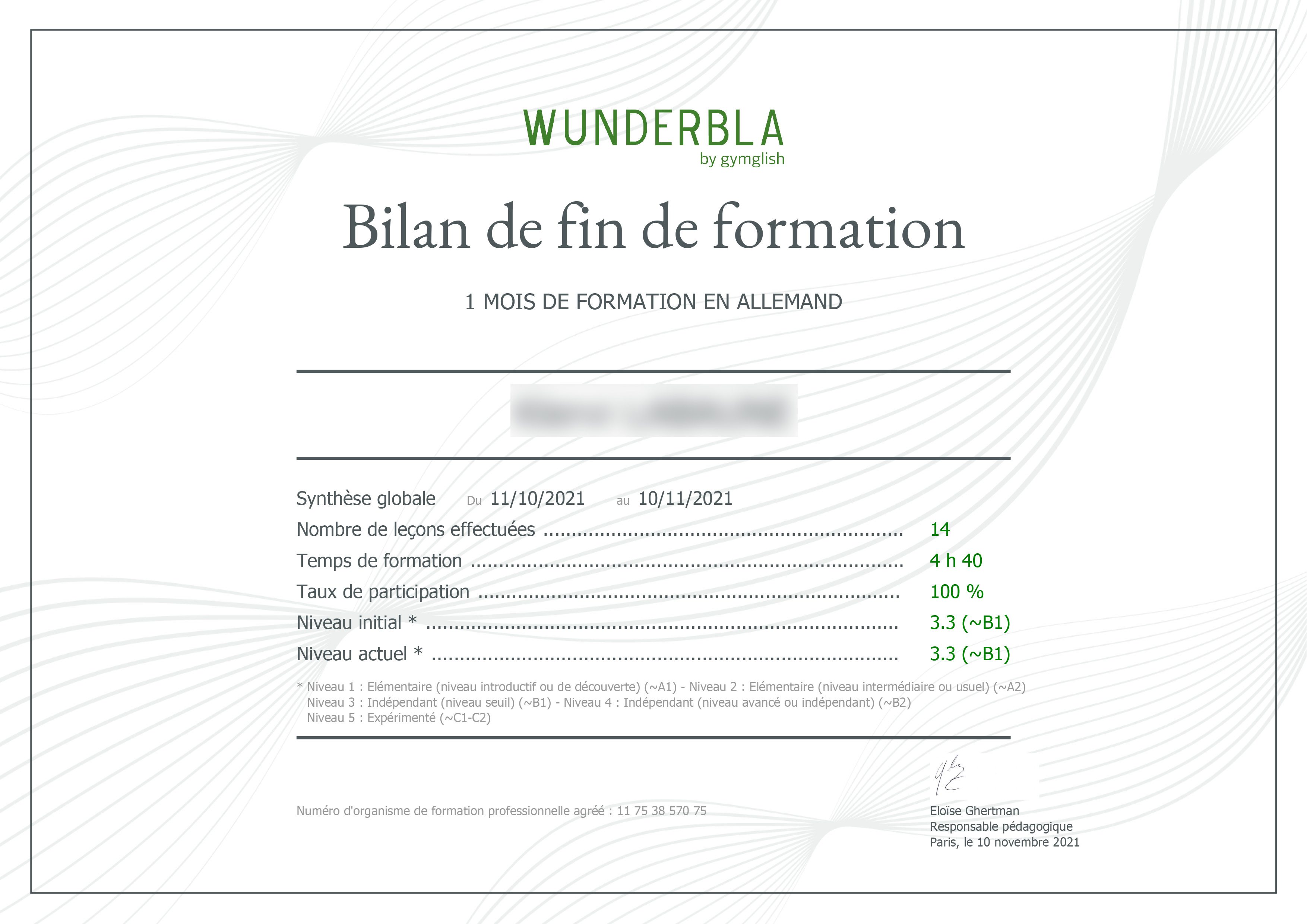 En fin de formation (6 mois minimum), chaque utilisateur reçoit un bilan pédagogique avec l'ensemble des statistiques de niveaux, progression et participation. Ce document renseigne non seulement sur les niveaux constatés en fin de formation, mais aussi sur les efforts d’apprentissage et révision faits en amont, taux d’assiduité, temps de formation, nombre de leçons traitées, etc.